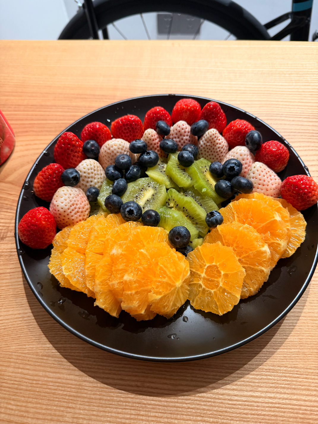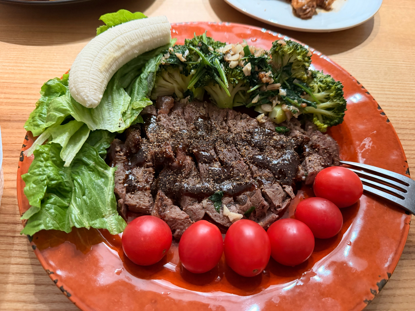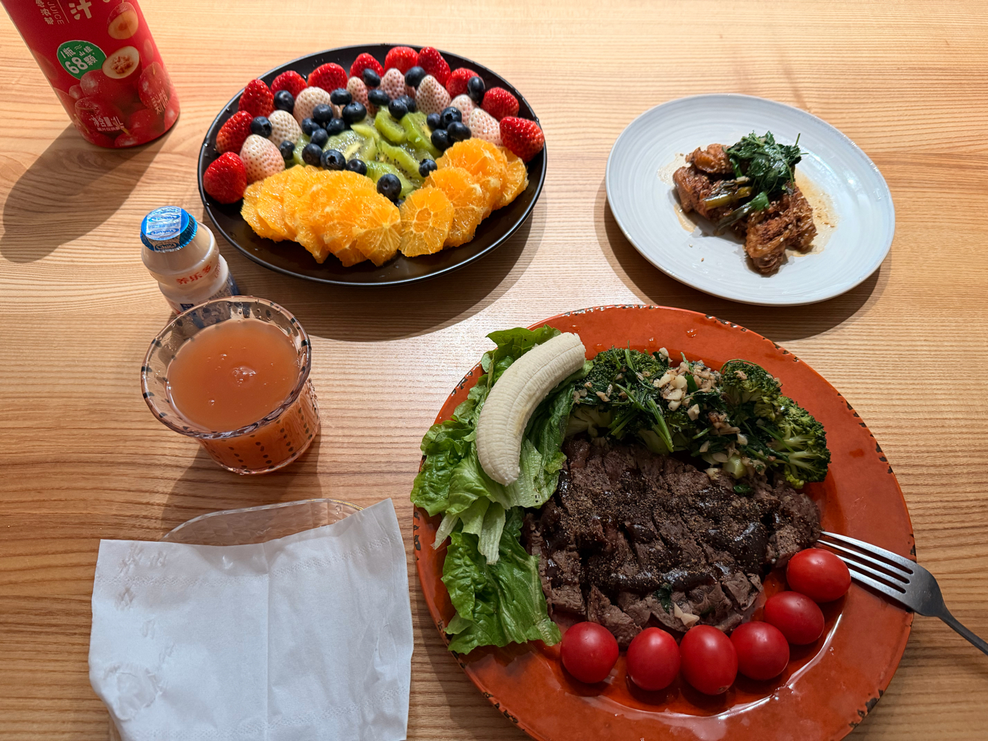 可乐鸡翅+牛排+水果拼盘 好好吃饭~