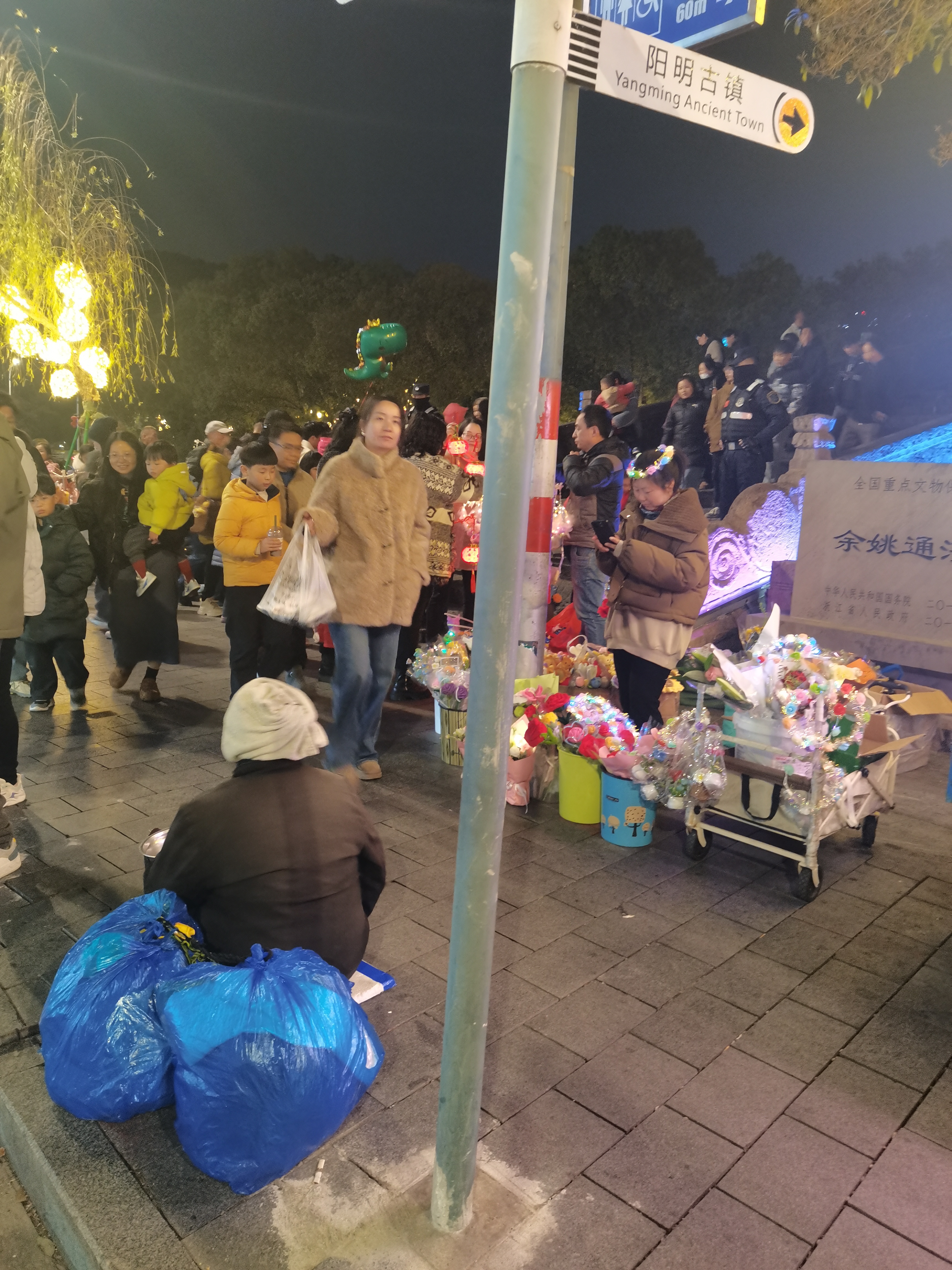 元宵节,在通济桥这人山人海的地方,一个老妇女坐在地上乞讨,显得格格不入,也没人管管。